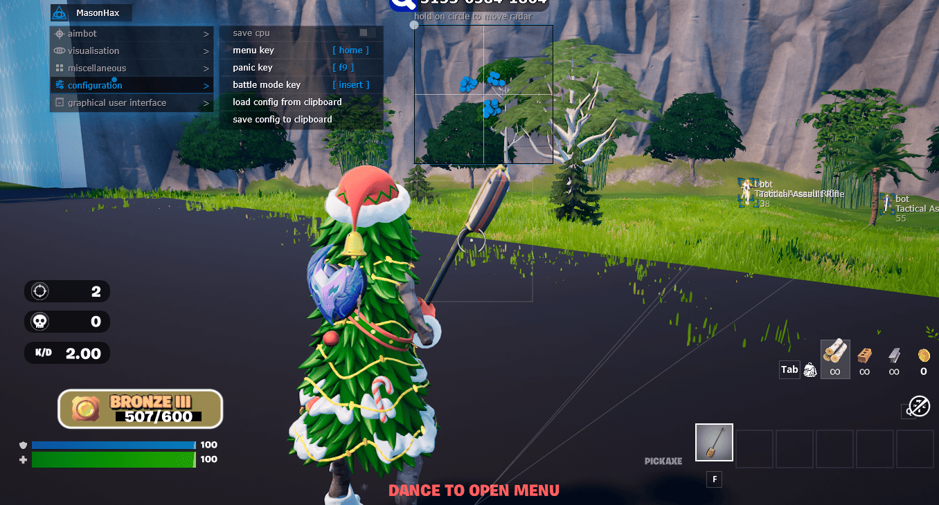 Mason (Masonhax) для Fortnite — минималистичный чит с компактным меню. Аимбот (предикт, авто-переключение, кости, FOV, smooth), ESP (ник, оружие, дистанция, скелет, бокс, snapline, перезарядка), радар 2D. Instant reload/revive, Stream-Proof, Panic Key, конфиги через буфер.