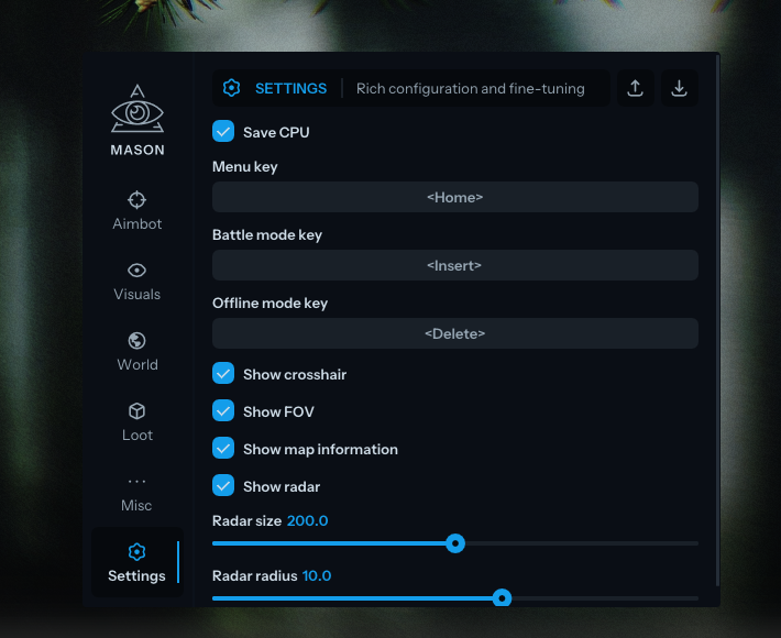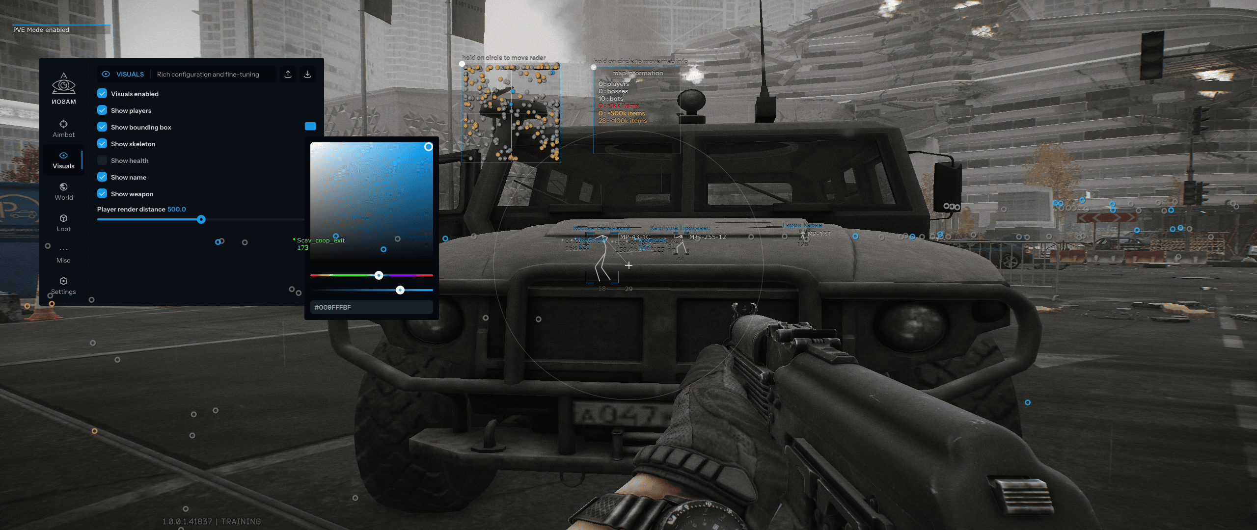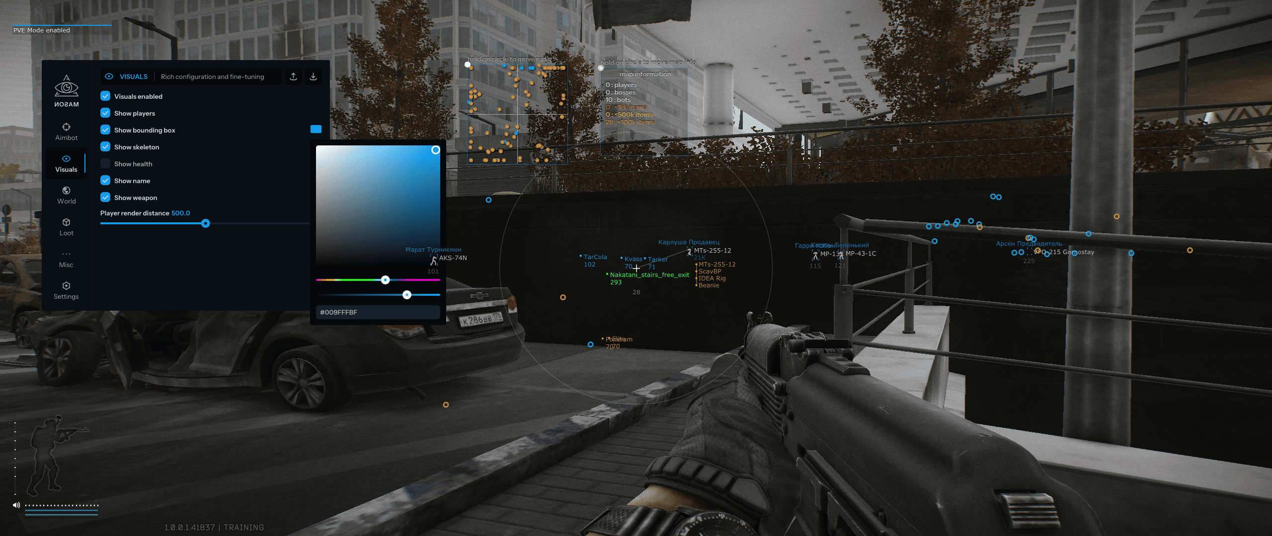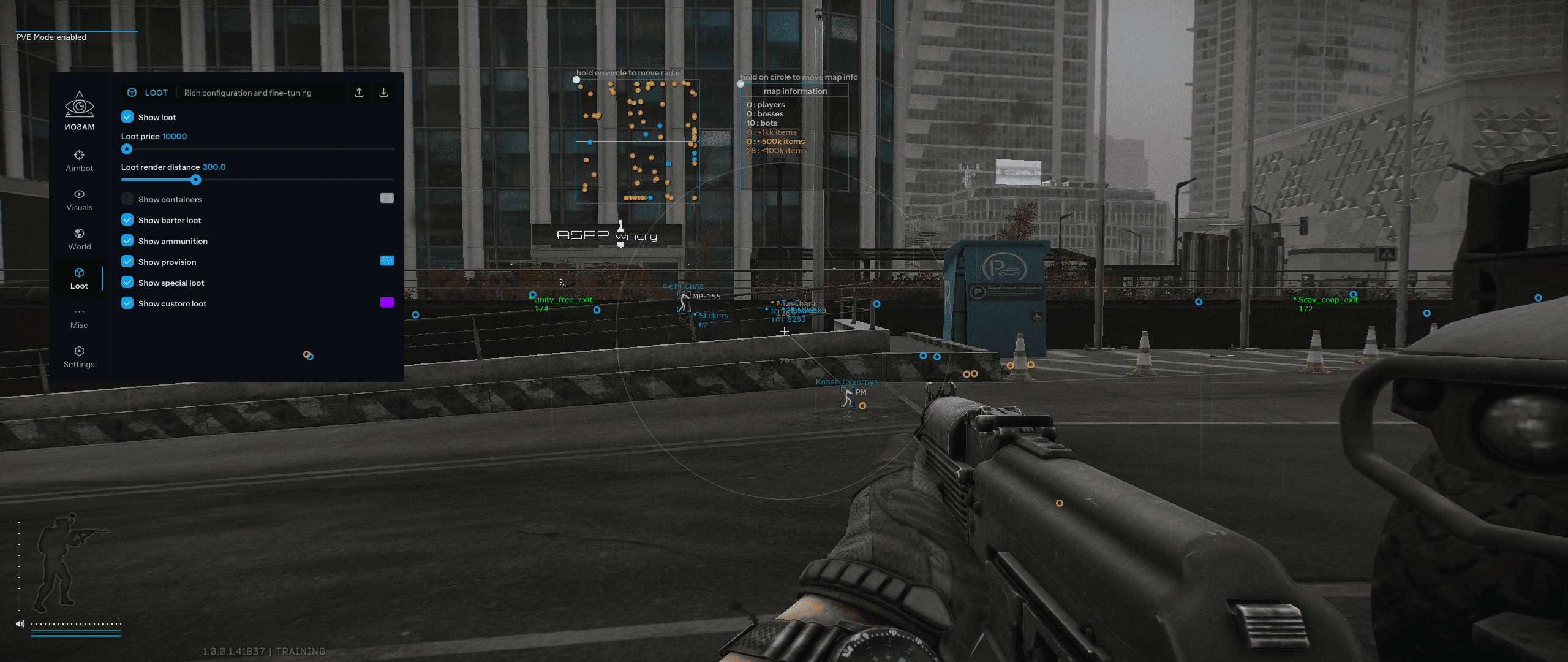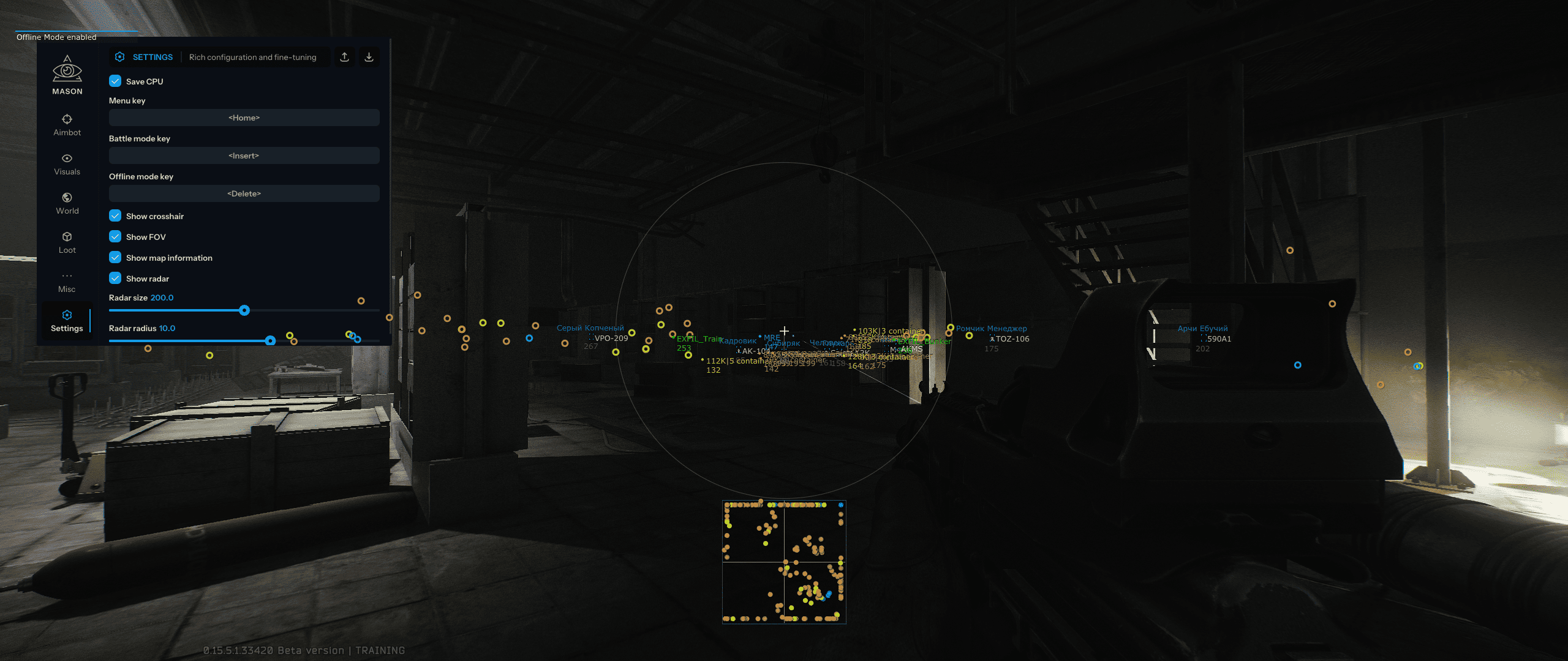 Mason Full — приватный чит для EFT с гибким Aimbot (Silent, смещение выстрела) и детальным ESP на игроков, лут, мины и выходы. Функции включают термальное зрение, отключение отдачи и состояний, мгновенное прицеливание, радар и режимы Battle/Offline. Полная настройка визуала, экономия ресурсов CPU и удобный интерфейс гарантируют доминирование. Софт полностью совместим и стабильно работает на всех сборках Windows 10-11