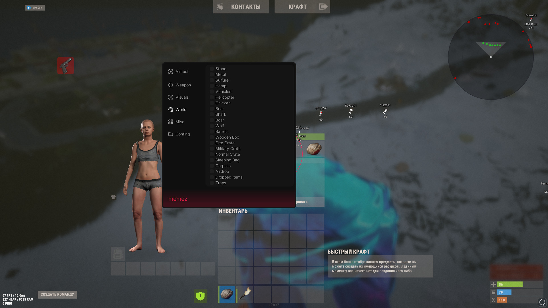 Memez Internal — приватный чит для Rust с двумя видами аимбота (Memory и Silent) и детальным ESP на игроков, лут и ресурсы. Включает FlyHack, Silent Walk, отключение текстур и гибкую настройку хоткеев. Интервальная работа гарантирует плавный отклик, а регулярные обновления — стабильность на любых патчах.