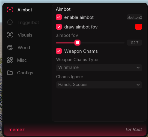 Memez для Rust — это профессиональный чит для опытных игроков. Включает функции ESP, AIMBOT, Loot и многое другое для комфортной и эффективной игры. Удобный, красивый лоадер и проверенная работа, успешно обходящая античит системы. Надежный и мощный инструмент для тех, кто ценит качество и результат.