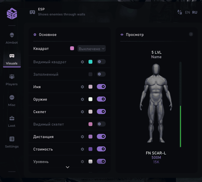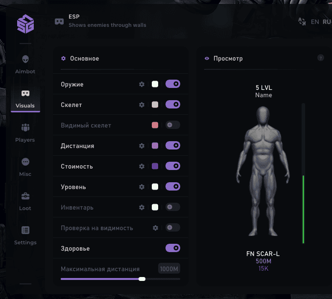 Visuals - это функция, которая отображает противника, дистанцию до него, а также его здоровье.