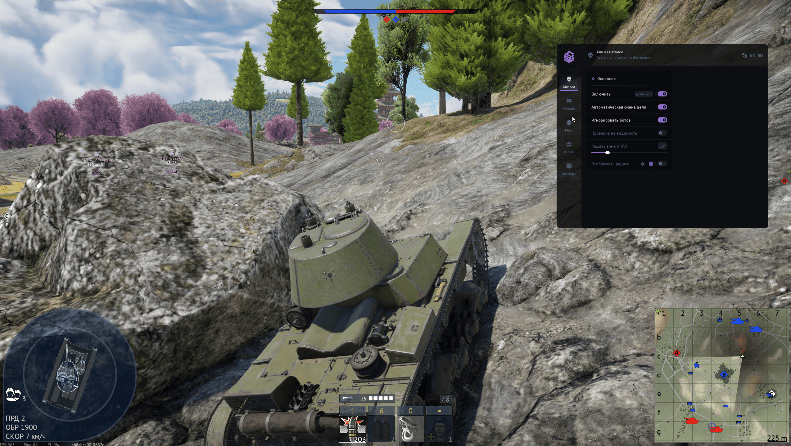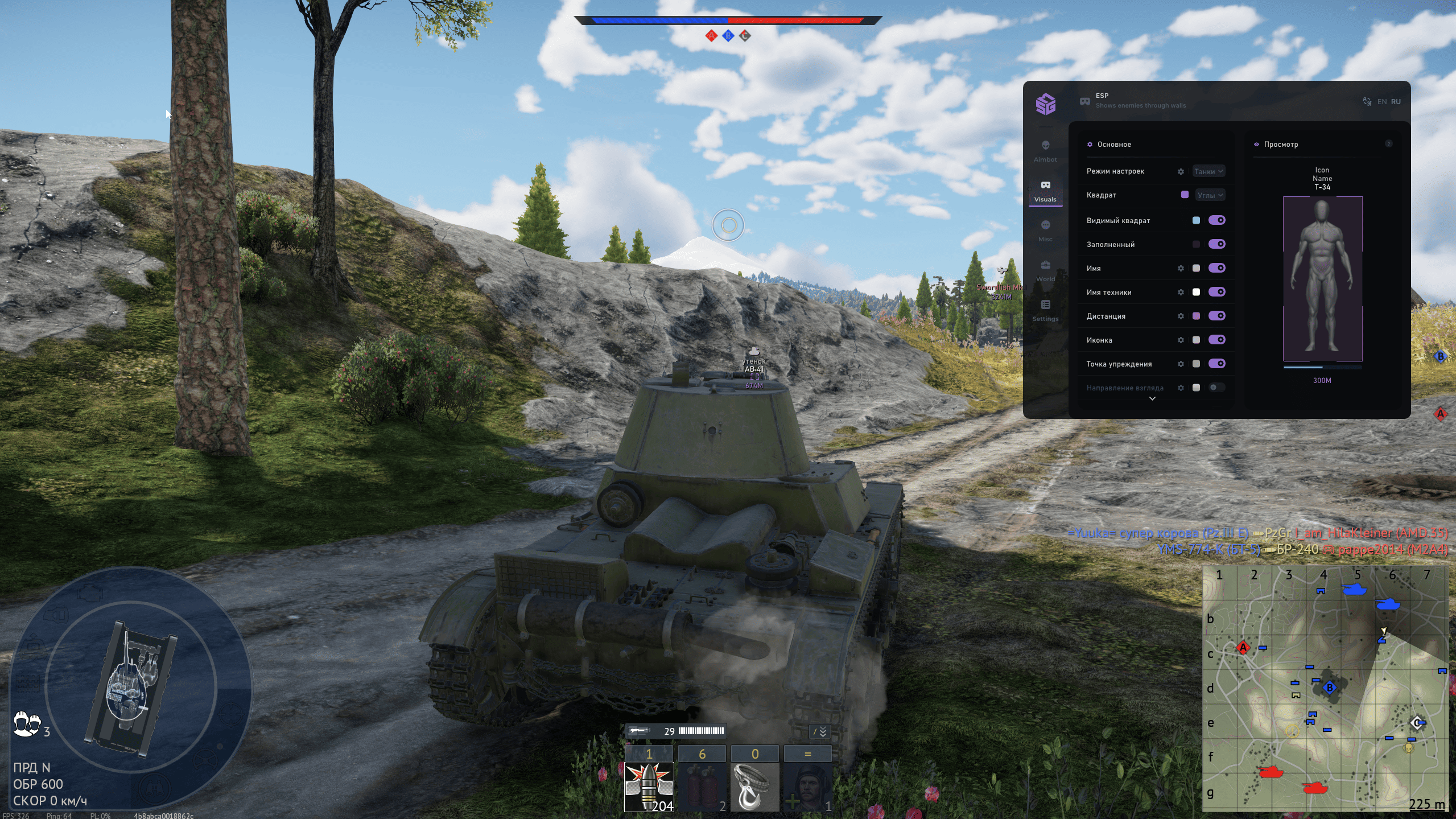SMG — приватный undetected чит для War Thunder с точным Aimbot и полным ESP/Wallhack для контроля всей техники на карте. Безопасность и незаметность софта гарантируют защиту от банов, позволяя вам уверенно доминировать в боях и управлять любой ситуацией без риска для аккаунта.