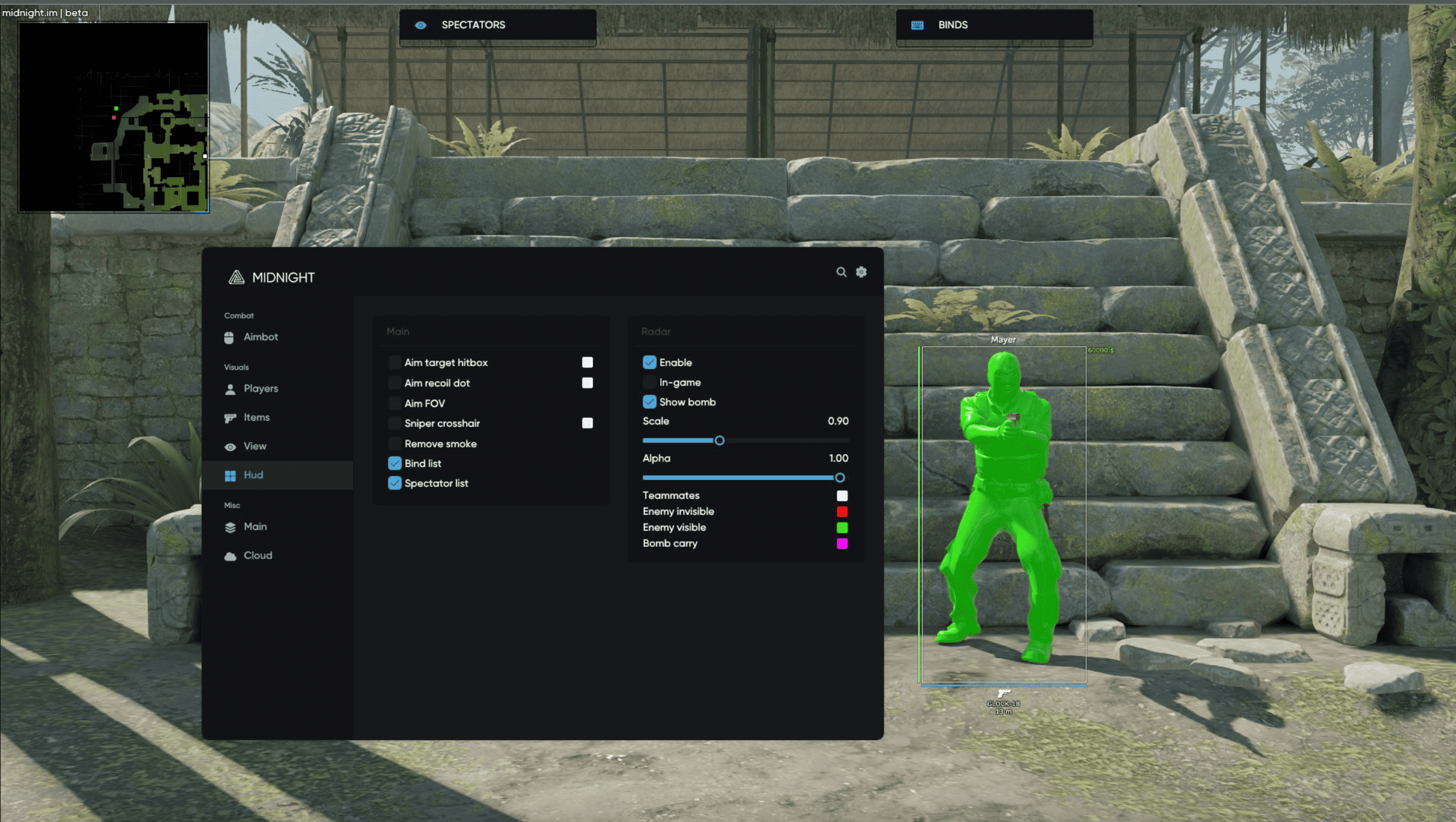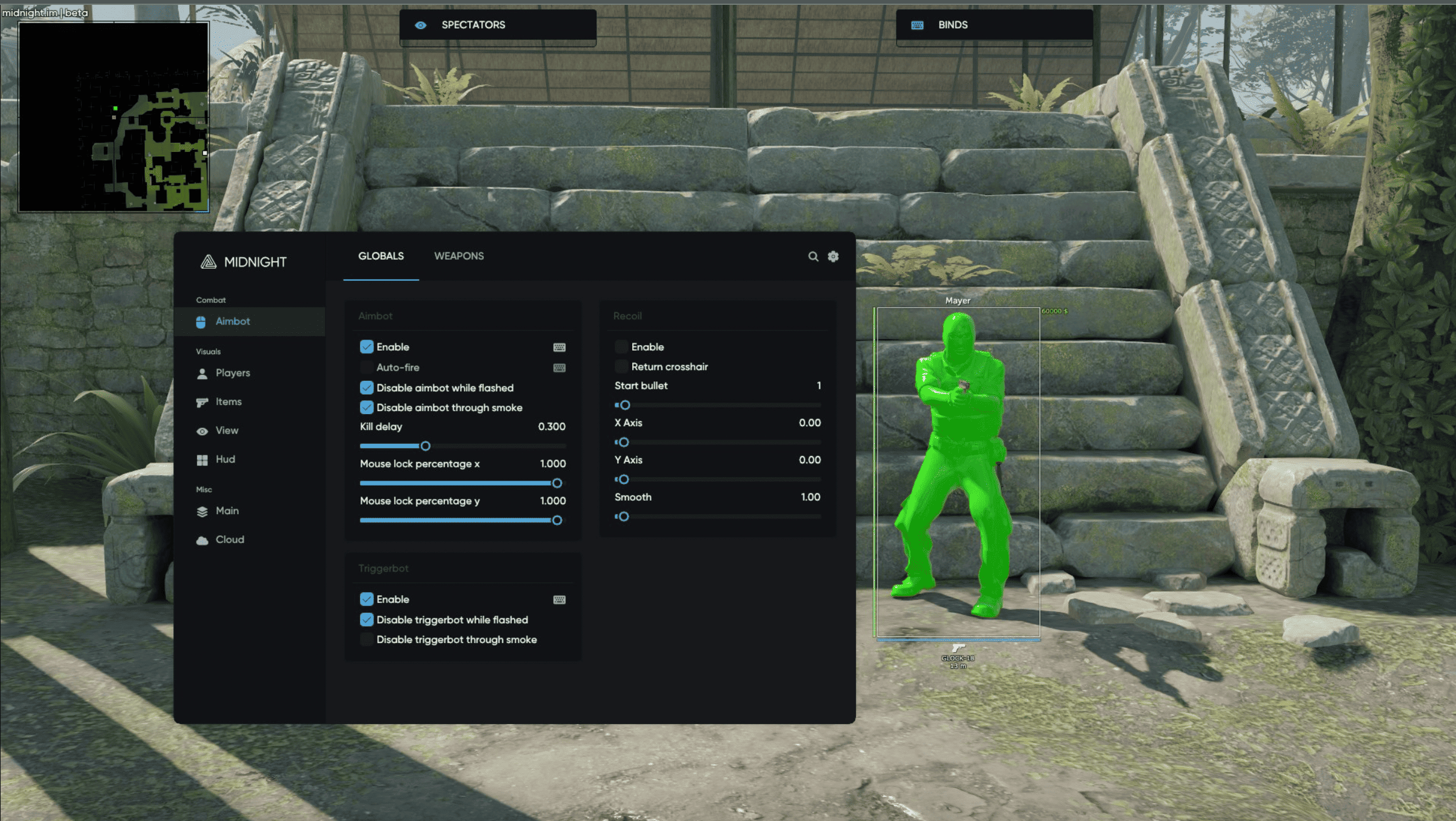 Midnight - это легендарный приватный чит для игры CS2, который давно зарекомендовал себя как надежное и эффективное средство для повышения игровых навыков. Он обеспечивает своим пользователям возможность уверенно действовать на поле боя благодаря разнообразным функциям, таким как аимбот, вх (валлхак), скрытность от античитов и многие другие. С многолетней историей недетектированного использования, Midnight является надежным партнером для опытных игроков, которые стремятся достичь лучших результатов в CS2.