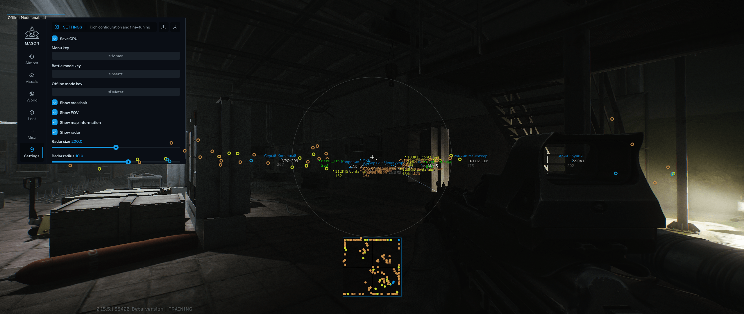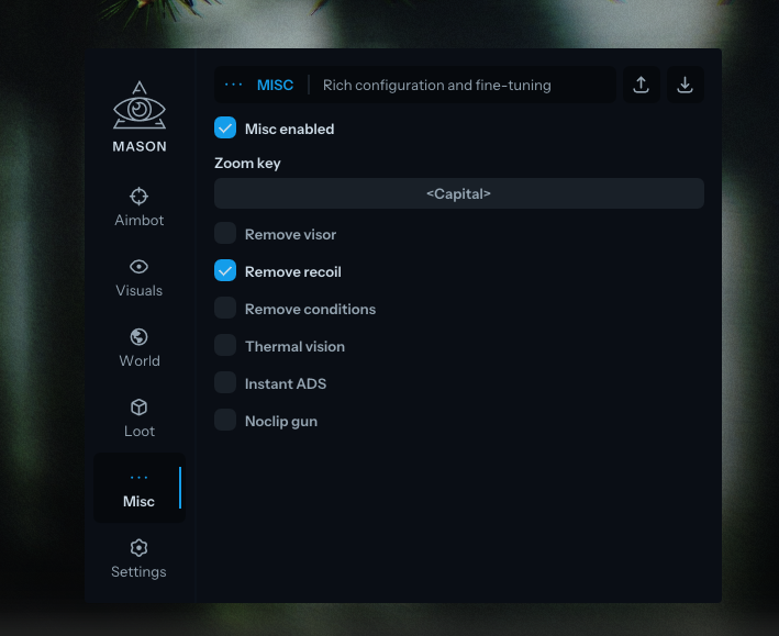 Mason Full — это приватный чит для Escape from Tarkov, предлагающий игрокам множество мощных функций, включая аимбот, ESP и систему обхода античита. С ним вы сможете уверенно доминировать на поле боя и получать максимальное удовольствие от игры, чтобы вы всегда были на шаг впереди.
