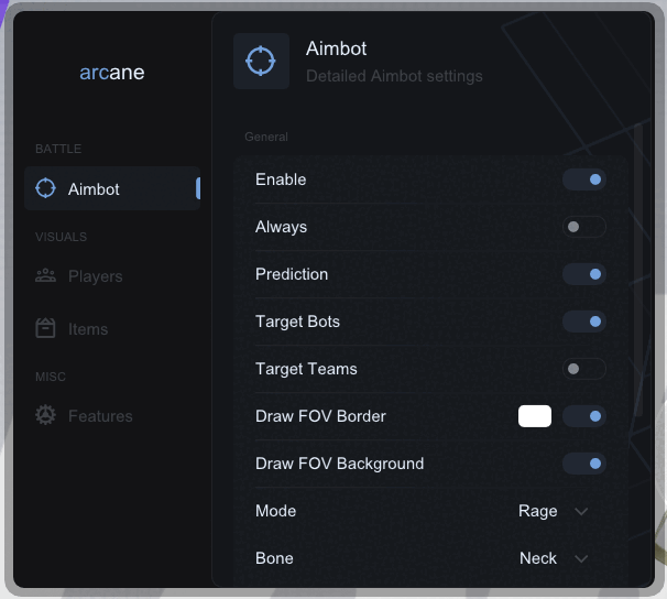 Arcane — приватный качественный чит, который разрабатывается для Farlight 84. В нем есть все необходимые функции для комфортной и продуктивной игры.