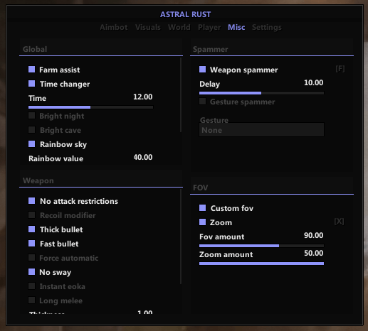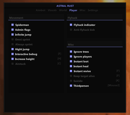 Astral - Приватный качественный чит для Rust! Чит без блокировок уже более 4 месяцев! В чите есть все нужные функции для комфортной игры, такие как: Aimbot, Esp, Misc! Если хочешь с удовольствием развиться на сервере, то этот чит идеально подойдет для тебя!