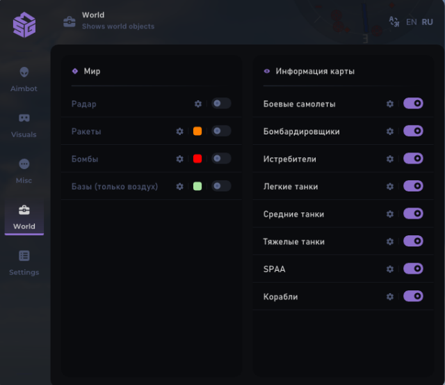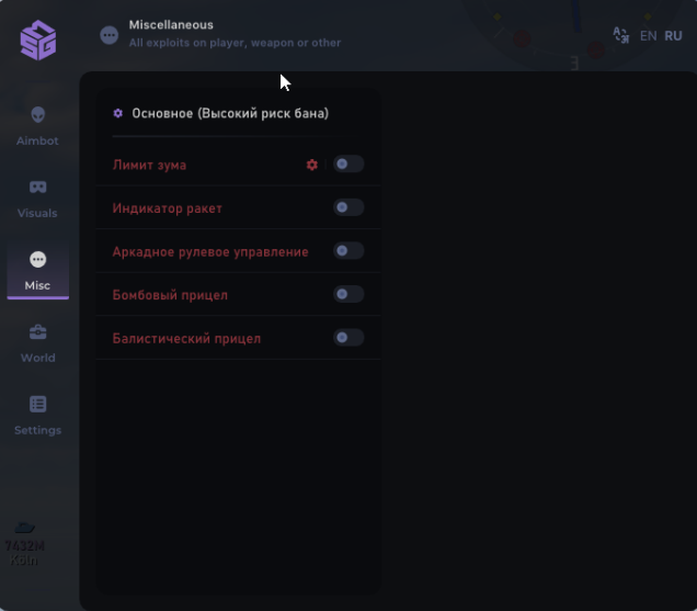 SMG — это мощный и универсальный чит для War Thunder, разработанный ведущими специалистами в области чит-программ. Он обеспечивает беспрецедентную точность при стрельбе, автоматическую смену целей и расширенные функции визуализации, позволяя игроку полностью контролировать бой и получать преимущество на поле боя. Надежный и скрытный, SMG гарантирует стабильную работу и минимальный риск обнаружения.